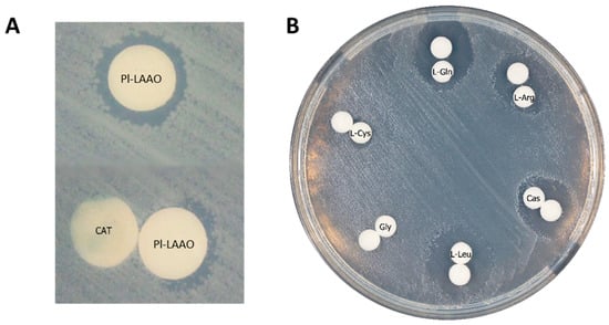 Antibiograms of purified recombinant Pl-LAAO against E. coli UM202. (A) Antibiograms in LB. Pl-LAAO disk loaded with 20 μL of purified protein at 7 × 10−2 mg mL−1. CAT—disk loaded with 20 μL of catalase 10 mg mL−1. (B) Antibiogram in M9 medium in the presence of some amino acids at 50 mM as a substrate. White disks contained 20 μl of Pl-LAAO at 0.25 mg mL−1. Cas—casamino acids 10%.