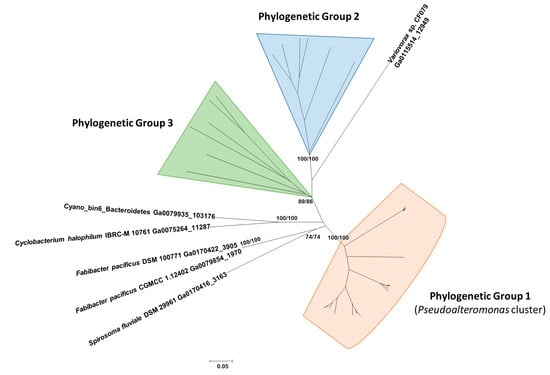 Previously, various microbial LAAOs with a quinone cofactor had been found with antimicrobial activity, such as the L-lysine ε-oxidases from the marine gammaproteobacteria Marinomonas mediterranea [], Pseudoalteromonas tunicata D2 [], Pseudoalteromonas flavipulchra JG1 [] and Rheinheimera aquatica GR5 []. To the best of our knowledge, this is first report on a FAD-containing LAAO with antimicrobial activity from a marine microorganism. Additionally, no protein with a sequence similarity to Pl-LAAO has been cloned or characterized at the molecular level so far. Hence, a BLASTp was performed against the Integrated Microbial Genomes (IMG) database to detect proteins similar to Pl-LAAO. A total of 49 genes were detected and, according to their phylogenetic distribution, the Pl-laao similar genes seem to have no ancient origin as they are not widespread in bacterial genomes, being detected only in three distinct phyla (Table 1). From the 49 detected proteins similar to Pl-LAAO, 28 were encoded by genes detected in the genomes from the genus Pseudoalteromonas and, specifically, 14 from Pseudoalteromonas luteoviolacea (Table 1). This represents 20.4% and 66.6% of the sequenced strains for each taxon, respectively. The phylogenetic analysis showed that similar proteins to Pl-LAAO from the genus Pseudoalteromonas constitute a well-defined cluster of proteins, suggesting that they have a common evolutionary origin (Figure 7 and Supplementary Figure S2). This fact and their high abundance in the Pseudoalteromonas genus indicate that this type of proteins may play an important role in these microorganisms, so they have been subjected to a selective pressure to be conserved throughout the evolution, particularly in P. luteoviolacea.