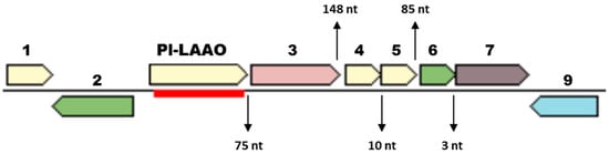 General genome region surrounding Pl-laao-like genes in P. luteoviolacea strains. (1) Hypothetical protein. (2) Tetratricopeptide repeat (TPR)-like response regulator. (3) Indolepyruvate decarboxylase. (4) and (5) Spondin_N similar proteins. (6) OmpR family response regulator. (7) Signal transduction histidine kinase. (8) Alcohol dehydrogenase. (9) Multidrug and toxic compounds extrusion (MATE) family efflux protein. Color code is for cluster of orthologous groups (COG) function category: Pink—carbohydrate transport and metabolism; green—transcription; gray—signal transduction mechanisms; light brown—unknown.
