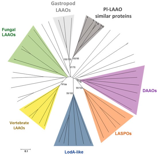 With the aim of investigating the phylogenetic relationships between the proteins similar to Pl-LAAO, they were aligned with MUSCLE (MUltiple SEquence Comparison by Log-Expectation), and then an evolutionary analysis was conducted using the software MEGA6 []. Phylogenetic relationships were inferred using both the neighbor-joining (NJ) and maximum likelihood (ML) methods. Three different phylogenetic groups, meeting the criterion of being supported by bootstrap values higher than 70% in both methods, were established (Figure 7).