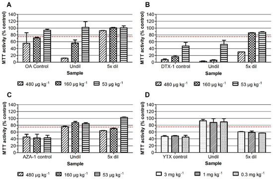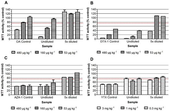 Effect on the MTT activity of neuro-2a cells of standards (control) as well as undiluted and 5 times diluted fortified mussel sample extracts. (A) OA; (B) DTX-1; (C) AZA-1; and (D) YTX. A DMSO solvent control was set at 100% and an arbitrary decision limit was set at 75% (Bodero et al., 2018). Data are expressed as mean ± SD (n = 3).