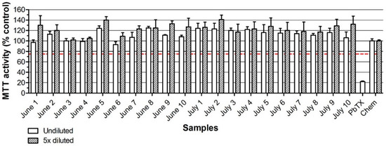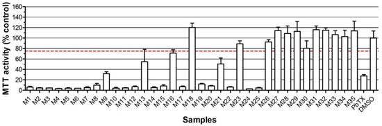 Effect on the MTT activity of neuro-2a cells with the addition of o/v of 35 samples tested before in Chile in the mouse bioassay. The spotted line represents the arbitrarily set decision limit (75% MTT activity). A DMSO solvent was used as a negative control and set at 100%. Data are expressed as mean ± SD.