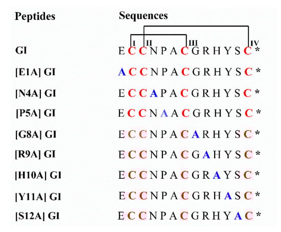 The following are available online at http://www.mdpi.com/1660-3397/16/12/507/s1, Figure S1: The HPLC chromatograms and mass spectrum of GI, [E1A] GI and [N4A] GI respectively; Figure S2: The HPLC chromatograms and mass spectrum of [P5A] GI, [G8A] GI and [R9A] GI respectively; Figure S3: The HPLC chromatograms and mass spectrum of [H10A] GI, [Y11A] GI and [S12A] GI respectively.