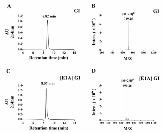 In this study, standard Fmoc solid phase peptide synthesis strategy was used to synthesize GI and its mutants. A two-step oxidation protocol was used to fold these peptides as described previously []. Briefly, CysI and CysIII were protected with S-trityl (S-Trt) while CysII and CysIV were protected with S-acetamidomethyl (S-Acm). The first disulfide bridge between CysI and CysIII was formed using the potassium ferricyanide oxidation method, and then the second disulfide bond was produced through iodine oxidation. All synthesized peptides were monitored by analytical Reversed-Phase High Performance Liquid Chromatography (RP-HPLC), and the purity of each analogue was above 95%. Typically, the retention of the fully oxidized peptide GI and [E1A] GI is 8.82 and 8.57 min respectively, and the molecular weight of GI and [E1A] GI is 1436.50 and 1378.52 Da respectively, which are identical with the theoretical molecular weight (Figure 2). The HPLC chromatogram and ESI-MS (Electrospray ionization mass spectrometry) data of other GI analogues are provided in the Supplementary Materials’ Figures S1–S3.