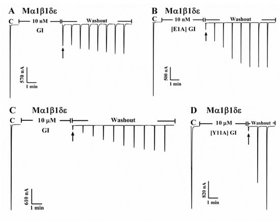 Blockade of mouse α1β1δε nAChR by GI, [E1A] GI and [Y11A] GI. Representative current traces showing the inhibition of mouse α1β1δε ACh-evoked currents by GI and [E1A] GI at the concentration of 10 nM (A, B), GI and [Y11A] GI at the concentration of 10 μM (C, D). Xenopus laevis oocytes expressing a given mouse α1β1δε nAChR were at a holding potential of −70 mV and were subjected to a 1 s pulse of ACh every minute as previously described []. After control responses to ACh, the oocyte was exposed to toxins for 5 min (arrow). The toxin was then washed out and the response to ACh was again measured. “C” indicates control responses to ACh.