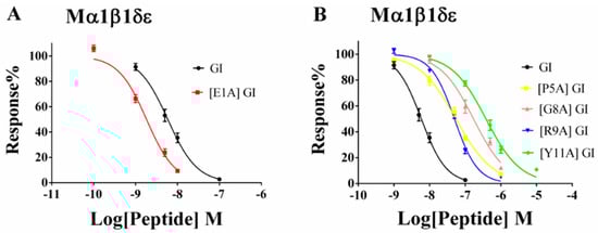 The concentration–response curves of mouse α1β1δε nAChR subtype for GI and alanine-substituted analogues. (A) The concentration–response curves for GI and [E1A] GI. peptide [E1A] GI shifted the curves to the left, relative to the parent peptide GI. (B) The concentration–response curves for GI, [P5A] GI, [G8A] GI, [R9A] GI and [Y11A] GI. [P5A] GI, [G8A] GI, [R9A] GI and [Y11A] GI were towards the right compared to the native GI. All data represent mean ± S.E.M, n = 7–10.