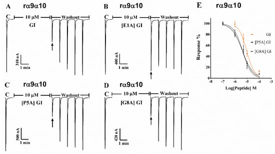 In addition, we observed a different current recovery time after the blockade by α-conotoxin GI, [E1A] GI and [Y11A] GI at the mouse α1β1δε nAChR, suggesting that single amino acid mutation possibly changed the interaction between ligands and receptors. Further research is needed in order to elucidate the molecular mechanism underlying their interaction. Various neuronal nAChRs, including α3β2, α3β4, α4β4, α7, and α9α10 were also screened. The electrophysiology assay indicated that alanine-substituted analogues failed to inhibit these receptors, except for α9α10. GI, [P5A] GI and [G8A]GI retained their activity at α9α10 at the micromole level. In contrast, [E1A] GI had little influence on α9α10 nAChR at a high concentration, and the selectivity of [E1A] GI at muscle α1β1δε versus neuronal α9α10 nAChR was improved compared to wildtype GI.