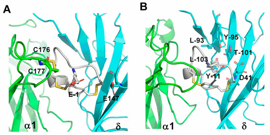 The structure of GI was revealed by NMR spectroscopy and X-ray crystallography [,,]. A right-handed helical turn containing an Asn4-Cys7 β-turn in the Gly8 to Tyr11 region is a typical structural feature of GI []. Gray et al. assumed that the shape of peptide GI was a triangular slab with Glu1, Pro5 and Arg9 situated at the corner []. As we know, the proline of loop1 in many α-conotoxins is conservative, and this amino acid plays a crucial role in 310-helix turn forming of conotoxins. Furthermore, Dutertre et al. demonstrated that 310-helix turn might play a crucial role in defining both the ligand conformation and receptor-binding activity []. Olivera, B. M el al. found that substituting Pro with Ala in α-conotoxin MI dramatically reduced the toxin’s potency at the α/δ site []. Similarly, the Pro5 mutation in GI might alter β-turn secondary structures, significantly reducing the activity of α1β1δε nAChR. Moreover, when we replaced Gly8, Arg9 and Tyr11 with Ala, three analogues, [G8A] GI, [R9A] GI and [Y11A] GI, suffered respectively 29.1-fold, 8.5-fold and 65.1-fold loss of their potencies on α1β1δε nAChR compared to GI, suggesting that the substitution of Gly8, Arg9 and Tyr11 with Ala probably had a significant impact on the right-handed helical turn. Meanwhile, Tyr11 in α-conotoxin GI was located at a general hydrophobic pocket by molecular modeling, and we also noticed that it interacts with hydrophobic amino acids, including Leu93, Tyr95 and Leu103 in the δ subunit (Figure 8B), which is consistent with previous studies that showed α-conotoxin MI interacted strongly with the δ subunit [,]. Janes, R. W et al. also suggested that a hydrophobic phenylalanine in this position contributed to anchoring to the receptor []. In contrast to the loss of inhibitory activity at most alanine substitutions, Glu1 replaced by Ala in α-conotoxin GI substantially improved the functional activity at α1β1δε nAChR.
