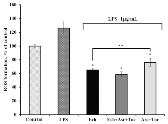 Influence of Ech and studied formulations on the lipopolysaccharide (LPS)-induced reactive oxygen species (ROS) formations in Vero cells. The formulations were tested at a concentration of five μg/mL. * p < 0.05; ** statistically significant differences between Asc + Toc and Ech (p ≤ 0.05).