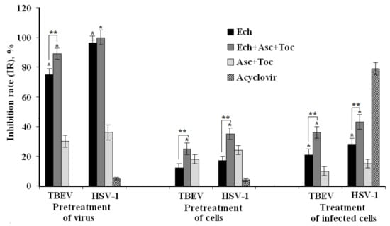 Since Ech and its composition with Asc and Toc showed significant antioxidant effects on both experimental models, and because of the ability of Ech to overcome the blood–brain barrier [], further investigations of their effects on the replication cycles of neurotropic viruses such as TBEV and HSV-1 accompanied by oxidative stress were performed. Earlier combinations of antiviral agents with antioxidants have been used for the treatment of some other viral infections, for example, at influenza-associated complications []. In this study, we have shown the possibility of enhancing the antioxidant and antiviral effects of Ech due to combination with other antioxidants. We have found that the most effective method of application of Ech and the studied composition is the pretreatment of viruses with the formulations (virucidal action). The antioxidant composition Ech + Asc + Toc also demonstrated stronger antiviral activity against TBEV and HSV-1 compared to Ech. The inhibitory concentrations (IC50) of the composition were half that of Ech, while the selective indices (SI) were twice as large as those of Ech (Table 2). It should be noted that regardless of the method of exposure of viruses and cells to the formulations, the virus inhibition rates of the composition of antioxidants was higher than that by Ech itself (p < 0.05, Figure 1).