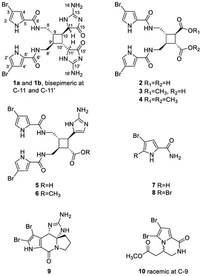 - Lindel, T. Chemistry and biology of the pyrrole-imidazole alkaloids. Alkaloids 2017, 77, 117–219. [Google Scholar] [PubMed]