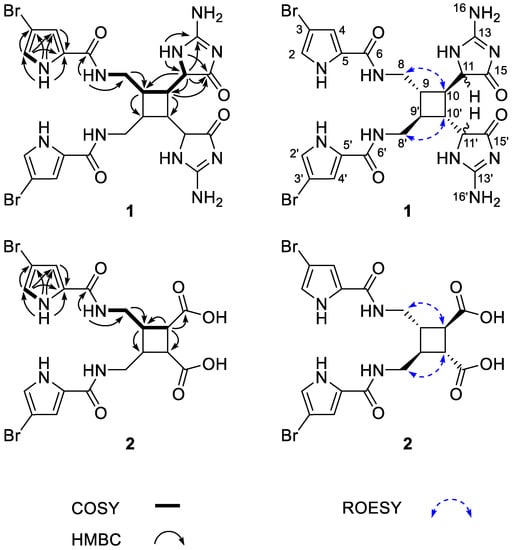 The molecular formula of ageleste C (2) was established to be C18H18Br2N4O6 (m/z [M + H]+ 544.9677, calcd. 544.9671) by HRFABMS analysis. The NMR data of this compound showed signals of nine carbons with attached protons, indicating a dimeric nature (Table 1). Comparison of the 1H and 13C NMR data with those of 1 revealed that the signals of the imidazoline moiety had been replaced with those of a carboxylic group at δC 174.0 (C-9), while those of the bromopyrrole and cyclobutane were intact (Table 1). This interpretation was confirmed by a combination of 2D NMR analyses in which the oxidative cleavage of the two imidazole moieties to carboxylic acids was clearly observed (Figure 2). Further supporting evidence was provided by comparing the spectroscopic data with those of congeners 3 and 4 in which the protons and carbons showed virtually identical chemical shifts. After the assignment of the relative configurations by ROESY experiments (Figure 2), the absolute configurations of the cyclobutane moiety were defined to be the same as those of their congeners by a comparison of their CD data (Figure S16).