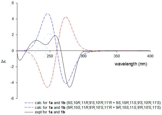The absolute configurations of the cyclobutane core were assigned by ECD calculations. Since 1a and 1b, bis-epimers at the C-11 and C-11′ stereocenters, existed as a mixture (1:1 v:v) in 1, both the experimental and calculated ECD data were determined in their dimeric form. The comparison of their ECD profiles clearly assigned the 9S, 10R, 9′S, and 10′R absolute configurations, which are consistent with known sceptrins (Figure 3) [,]. Thus, the structure of 1, designated dioxysceptrin, was determined to be a mixture of 11,11′-dioxo derivatives of sceptrin alkaloids.