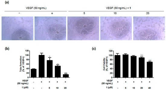 Anti-angiogenic activity of compound 1. (a) Inhibitory effects of compound 1 in vascular tube formation induced by VEGF were visualized using optical microscopy. (b) The lengths of tubes were quantified and compared to the VEGF-treated control. (c) Cell viability after treatment of compound 1 in the presence of VEGF for 24 h was measured by MTT and compared to the control. Data are presented as the mean fold changes ± SD of three independent experiments. * p < 0.05, ** p < 0.01, *** p < 0.005 by t-test.