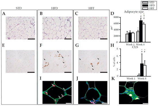 Morphology and immunohistochemistry of eWAT. Representative histological sections of eWAT from mice fed STD (A,E), HFD (B,F,I) or HFF (C,G,J,K) diet at Week 8. Hematoxylin and eosin staining for morphometry of adipocytes (A,B,C), as evaluated in (D). Immunohistochemical staining using macrophage marker MAC2 for quantification of CLS (E,F,G; arrows), as evaluated in (H). Representative sections showing the detection of macrophage proliferation within CLS based on immunofluorescence staining (I,J; nuclei by DAPI, blue; macrophages by anti-F4/80, green; surface of lipid droplets by anti-perilipin 1, white; proliferating nuclei by anti-Ki67, red; proliferating macrophages are indicated with arrows). Representative section showing multinucleated giant cells (K). Data are means ± SD; n = 6–8. * Significant difference from Week 1 between mice on same diets; † significant difference from HFD for the same period of dietary intervention; # significant difference from STD for the same period of dietary intervention. Bar represents 200 μm (A,B,C,E,F,G) or 20 μm (I,J,K). For morphology and immunohistochemistry of eWAT at Week 1, see Supplementary Figure S1.