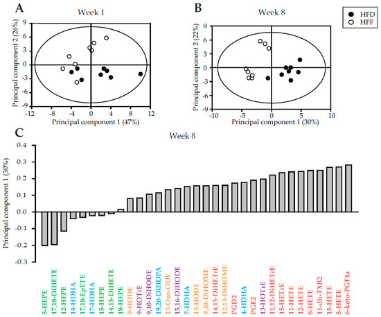 Principal component analysis of the lipidomic data from eWAT of the HFD and HFF mice. Score plots of the principal components 1 and 2 were generated using the lipid mediator profiles at Week 1 (A) and Week 8 (B). At Week 8 (C), results were expressed as a contribution score plot showing one bar per variable, indicating which species differ most between the groups and in which direction. Lipids derived from AA (red), LA (orange), ALA (purple), DHA (blue), and EPA (green) are discerned by colors. For the source data and the abbreviations, see Supplementary Table S1.