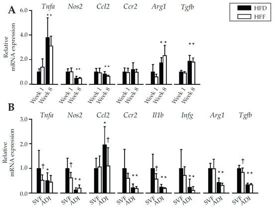 Gene expression of pro- and anti-inflammatory markers in eWAT of mice fed HFD or HFF diet for 1 or 8 weeks (A), or in stromal-vascular fraction (SVF) cells or adipocytes (ADI) isolated from eWAT of mice fed the respective diets for 8 weeks (B). Data were normalized to the geometrical mean of two reference genes, Hprt and EF1α in (A), and EF1α and Rn18s in (B), and expressed relative to the HFD mice at Week 1 for whole eWAT depot (A) or to SVF of HFD group (Week 8) for SVF and ADI (B). Data are means ± SD; n = 6–8. * Significant difference from Week 1 between mice with the same diet; † significant difference for the same period of dietary intervention.