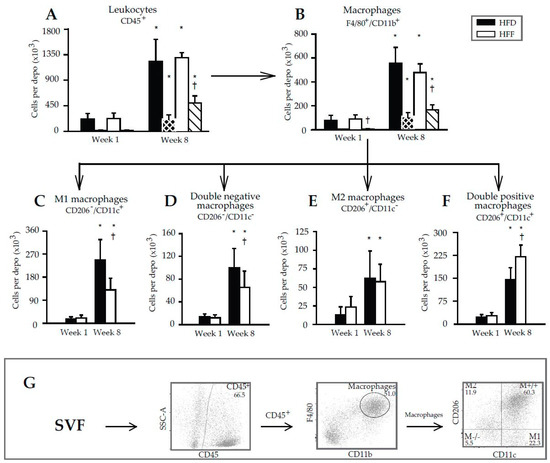 Flow cytometry analysis of immune cell subsets in SVF isolated from eWAT. Numbers of cells are calculated per depot. Arrows indicate the gating strategy used. Cells were first gated on size and singularity for further analysis. Single cells were gated based on the expression of CD45 to identify leukocytes (A). Leukocytes were then gated on the co-expression of CD11b and F4/80 to identify macrophages (B). Finally, macrophages were further subdivided based on the expression of CD206 and CD11c into: M1 macrophages (CD206−/CD11c+; C), double-negative macrophages (CD206−/CD11c−; D), M2 macrophages (CD206+/CD11c−; E) and double-positive macrophages (CD206+/CD11c+; F). Striped columns (black with white stripes, HFD; white with black stripes, HFF) show the amount of proliferating cells per depot, which were detected using antibodies specific for the Ki67 proliferation marker. Illustrative flow cytometry plots and gating strategy are also shown (G). Data are means ± SD.; n = 6–8. * Significant difference compared to Week 1 with the same diets; † significant difference between the diets for the same period of dietary intervention.