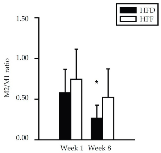 Further subfractionation of the macrophage population was performed using the CD206 and CD11c markers, resulting in the detection of four different macrophage subtypes (Figure 4C–F). At Week 1, no differences between the dietary groups were found. At Week 8, the eWAT content of both CD206−/CD11c+ (M1; Figure 4C) and CD206−/CD11c− (double negative; Figure 4D) macrophages was relatively low in the HFF mice. The eWAT content of CD206+/CD11c− (M2; Figure 4E) macrophages did not differ between the subgroups, but CD206+/CD11c+ (double positive; Figure 4F) macrophages were more abundant in the HFF mice. The proportion in the content of M2 and M1 macrophages (i.e., the M2/M1 ratio; Figure 5) decreased between Week 1 and Week 8 in the HFD and tended to decrease in the HFF mice. The M2/M1 ratio tended to be higher in the HFF mice and this difference tended to increase with the duration of the dietary intervention. Both the relatively low number of M1 macrophages in the HFF mice at Week 8, and the relatively high number of double positive macrophages in these mice are consistent with the anti-inflammatory effect of the omega-3 PUFA supplementation [20,46].