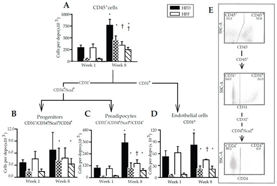 Flow cytometry analysis of non-immune cell subsets in SVF isolated from eWAT. The numbers of cells are calculated per depot. Arrows indicate the gating strategy used. Cells were first gated on size and singularity for further analysis. Single cells were gated on the lack of CD45 expression to identify non-lymfoid cells (A). CD45− cells were then gated on CD31 expression to identify endothelial cells (D). CD31− cells were further subdivided based on the expression of Sca1, CD34 and CD24 into progenitors (CD34+/Sca1+/CD24+; B) and preadipocytes (CD34+/Sca1+/CD24−; C). Striped columns (black with white stripes, HFD; white with black stripes, HFF) show the amount of proliferating cells per depot, which were detected using antibodies specific for the Ki67 proliferation marker. Illustrative flow cytometry plots and gating strategy are also shown (E). Data are means ± SD; n = 5–6. * Significant difference compared to Week 1 for mice fed the same diet; † significant difference between the diets for the same period of dietary intervention.