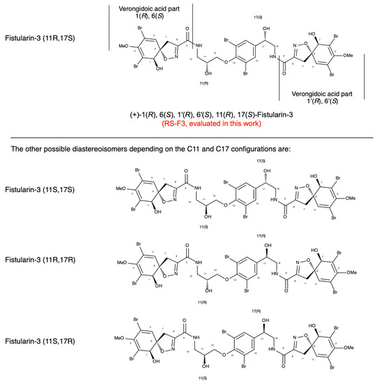 Due to the similarities of 1H and 13C NMR spectra of fistularin stereoisomers [25] confusion exists regarding the absolute configurations of C11 and C17 carbons of fistularins. While the configuration of the verongidoic acid part was established as 1(R), 6(S) for C1 and C6, the absolute configuration at the two secondary carbinols C11 and C17 is rather complicated. This high molecular weight molecule presents four secondary alcohols that hampered the co-determination of their absolute configuration by chemical modification and NMR studies. Suitable crystals for X-ray studies have never been obtained for one of the stereoisomers of fistularin-3. Moreover, the carbon configuration also seems to vary depending on sponge species, and even mixtures can occur [25]. The name 11-epi-fistularin-3 has been used to identify a molecule isolated from Aplysina oroides, which was recognized as a 11R isomer of fistularin-3 extracted from Aplysina cauliformis, attributing to this latter the 11S configuration [25]. Finally, the C17 configuration of all fistularin-3 isomers remains still undefined and the term isofistularin-3 is mainly used to indicate a generic fistularin-3 isomer so far.