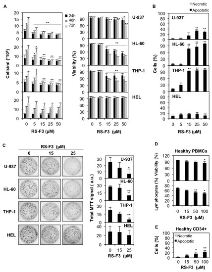 Colony formation assays showed a decrease of total cell growth in RS-F3-treated U-937, HL-60, and THP-1 at 25 µM, whereas the growth of HEL cells was not affected, which is in line with the other data (Figure 2C). To assess differential toxicity, we used healthy peripheral blood mononuclear cells (PBMCs). 100 µM RS-F3 reduced cell viability by about 14% (Figure 2D, upper panel). These results were confirmed by a flow cytometry analysis of the distribution of the lymphocyte population from healthy donors showing a minor, although significant, effect of the treatments (Figure 2D, lower panel). We validated our results by RS-F3-treated healthy proliferating primary human CD34+ cells. After 44 h of treatment, the viability of CD34+ cells was only moderately affected by RS-F3, even at the highest concentrations (22.5% apoptotic cells at 100 µM) (Figure 2E).