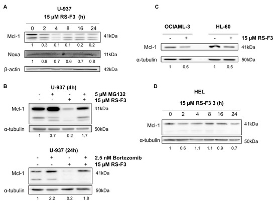 To investigate involvement of molecular markers well-known to contribute to AML cell survival in the effect of RS-F3, we assessed the expression of the anti-apoptotic protein Mcl-1, associated with resistance to chemotherapy in AML [29,30]. Kinetic analysis revealed that Mcl-1 protein levels were decreased in U-937 cells from 2 h of treatment (Figure 3A). Since proteasome-mediated Mcl-1 degradation is a well-described mechanism of Mcl-1 regulation [31], we co-treated U-937 cells with proteasome inhibitors MG132 and bortezomib to rescue Mcl-1 levels. In the presence of proteasome inhibitors, Mcl-1 decrease was prevented by 30% and 60% suggesting that decreased Mcl-1 levels are in part due to proteasomal degradation (Figure 3B). At the same time, the protein levels of the Mcl-1 destabilizer Noxa remained unchanged (Figure 3A), suggesting that Noxa is not involved in the observed Mcl-1 downregulation. A similar decrease of Mcl-1 protein levels was also observed in two other AML cell lines, OCIAML-3, and HL-60 (Figure 3C). Interestingly, Mcl-1 protein levels remained unaffected in AML M6 erythroleukemia HEL cells, which were not affected by RS-F3 treatment (Figure 3D).
