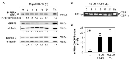 Effect of RS-F3 on ER stress markers in U-937 cells. U-937 cells were treated with 15 µM RS-F3 for the indicated time points followed by (A) Western blot analyses of PERK, GRP78, and sestrin-2; (B) end-point PCR analysis of XBP1 mRNA in its whole and spliced (XBP1s) forms; and (C) analyses of CHOP mRNA levels. Cells treated with 500 nM thapsigargin (Th.) were used as positive control for ER stress induction (2 h for XBP1 splicing, 24 h for other experiments). Histograms represent the mean ± SD of three independent experiments. Blots and gels are representative of three independent experiments. ** p ≤ 0.01.