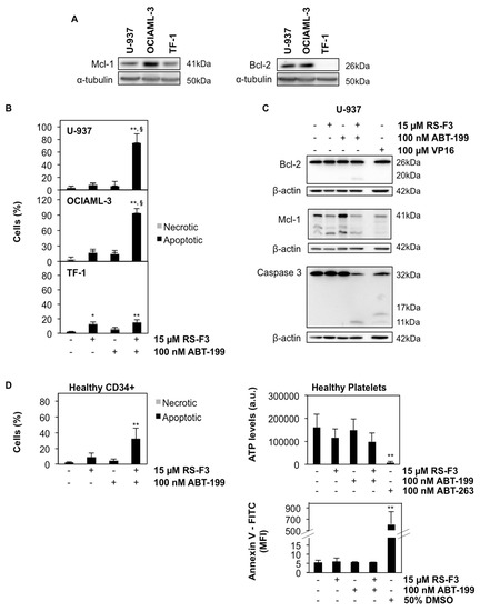 Effect of combination treatments of RS-F3 and ABT-199 in AML cell lines. (A) Western blot analysis showing basal levels of Mcl-1 and Bcl-2 in U-937, OCIAML-3, and TF-1 cells. (B) Cells were treated for 20 h with 15 µM RS-F3 followed by 24 h of 100 nM ABT-199, then nuclear morphology analysis was performed. (C) Western Blot analyses of Bcl-2, Mcl-1, and caspase 3 in U-937 treated as above. Cells treated with 100 µM VP16 for 3 h were used as a positive control for caspase 3 cleavage. (D) Nuclear morphology analysis of healthy CD34+ cells treated as above (left panel). CellTiter-Glo analysis (right upper panel) and annexin V staining (right lower panel) of healthy platelets treated as above. Cells treated with either 100 nM ABT-263 for 24 h or 50% DMSO for 1 min were used as positive control for platelet viability assays. Blots are representative of three independent experiments. Histograms represent the mean ± SD of at least three independent experiments. Asterisks indicate statistical difference with respect to control. The symbol § indicates statistical difference of combination treatments with respect to both compounds taken alone. * p ≤ 0.05, ** p ≤ 0.01; § ≤ 0.01. a.u.: arbitrary units, MFI: Mean fluorescence intensity.