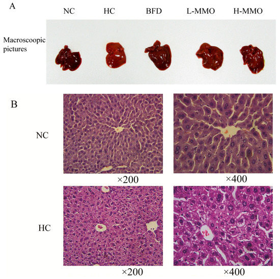 Macroscopic picture and HE staining liver (original magnification ×200 and ×400) from NC, HC, BFD, L-MMO and H-MMO. Groups: NC = normal control; HC = HFD control; BFD = HFD + Bifendate; L-MMO = HFD + 50 MMO mg/kg; H-MMO = HFD + 250 MMO mg/kg.