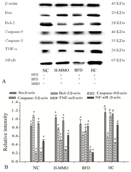Effect of MMO on hepatic protein of key regulation involved in lipid metabolism, inflammation and apoptosis in liver tissues of NAFLD mice (A,C). Semi-quantitative analysis of Bax, Caspase-9, Caspase-3, TNF-α, Bcl-2 and NF-κB (B) was performed by calculating the density of Western blot bands. AMPK-α, SREBP-1c and PPAR-α (D) was performed by calculating the density of Western blot bands. Protein expression was analyzed by Western blot and normalized to β-actin. Values are expressed as means ± SD. Values with different letters are significantly different in the groups (# p < 0.05 compared with NC; * p < 0.05 compared with HC). Groups: NC = normal control; HC = HFD control; BFD = HFD + Bifendate; H-MMO = HFD + 250 MMO mg/kg.