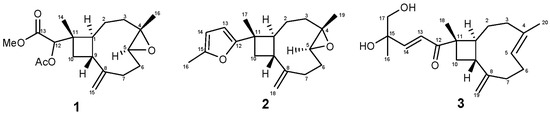 - Yamada, K.; Ujiie, T.; Yoshida, K.; Miyamoto, T.; Higuchi, R. Sinulobatins A–D, new amphilectane-type diterpenoids from the Japanese soft coral Sinularia nanolobata. Tetrahedron 1997, 53, 4569–4578. [Google Scholar] [CrossRef]