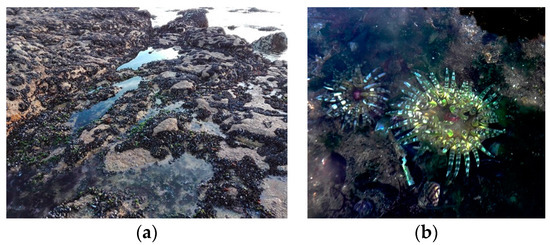 Sampling site at Praia da Memória, Porto, Portugal: (a) Picture of tide pools in rocks where inhabits the species of interest Bunodactis verrucosa. Note the remained pools at low tide and the relative abundance of mussels in the intertidal community; (b) Picture of two individuals of B. verrucosa from the sampling site.
