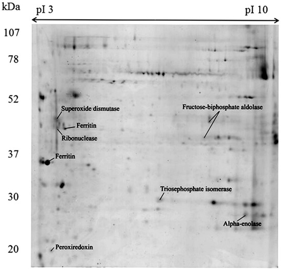 On the other hand, Ferritin is one of the most important proteins in iron metabolism, acting as primary iron storage protein or iron transporter, solubilizing iron and thus regulating its homeostasis [60,61]. Peroxiredoxin, also called thioredoxin peroxidase or alkyl hydroperoxide reductase, has been proposed as antioxidant protein [62,63,64]. Both proteins, seem to play an important role by protecting the cells against reactive oxygen species [65], so they are likely to be natural anti-Ultraviolet (UV) radiation agents [66]. Similarly, superoxide dismutase is another relevant antioxidant protein [65,67]. The high expression of this protein as part of the antioxidant defense system makes sense, since aerobic organisms need to deal with oxygen species produced as a consequence of aerobic respiration and substrate oxidation [67].