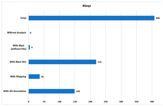 The proteomics identification pipeline using the Maquant software and 4 sequence databases, retrieved mostly “predicted” protein products. Therefore, these sequences were further blasted and mapped using the Blast2Go software (version 2.4.4) [73], (Figure 3). From a total of the 412 proteins identified with Maxquant software, 408 were successfully mapped using the Blast2Go software (Figure 3). The remaining four proteins, which were not submitted to further analysis, corresponded to potential contaminants. Out of the total number of proteins analyzed (408), 149 proteins were successfully annotated, representing the 36.5%. Thus, 259 proteins remained without Gene Ontology (GO) annotation, of which only four proteins were blasted without hits, 36 were mapped and 219 yielded positive hits. In total, 223 proteins were not included into the GO annotation considering the level 2 of protein classification, likely due to the absent of similar protein sequences in the protein databases. Moreover, most of these proteins retrieved as hits from cnidarian databases were “predicted”. This result confirms the limited information known about sea anemones and cnidarians products.