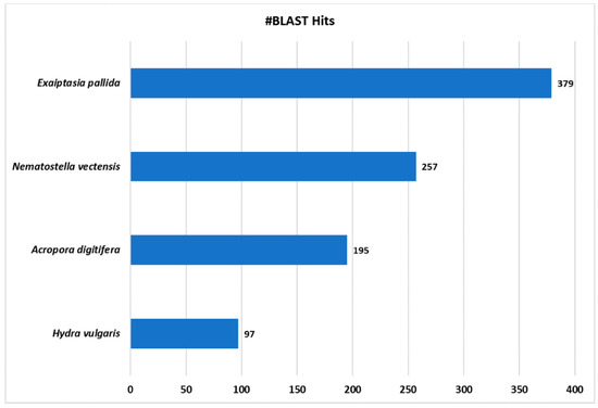 Among the four databases analyzed, most hits corresponded to the species E. pallida, followed by N. vectensis (Figure 4), as expected according to its relative phylogenetic position [74], although E. pallida has the largest number of proteins among the databases used. Afterwards, the proteins identified as positive hits were functionally annotated per the GO nomenclature. Then, GO terms were assigned to each contig and annotated per GO Distribution by Level (2), regarding the three major GO categories: Biological Process (BP), Molecular Function (MF) and Cellular Components (CC).