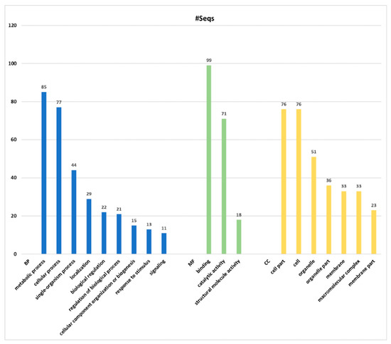 In total, 86 proteins were included in the category of the CC. Among them, 76 proteins (88.37%) matched for “cell part” and “cell”. However, this is an ambiguity, since all sequences detected as “cell part” are part of the “cell” category (Figure S2). Although, other proteins represented by the sublevels, related to cytoplasmic elements as part of intracellular components, were also subcategories of the “cell”. The GO “intracellular” was more represented with 73 proteins (84.88%) in level 3 than those “organelle” and “membrane” in the superior level 2, with 51 proteins (59.3%) and 33 proteins (38.37%), respectively.