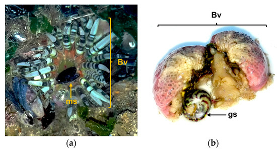 Evidence found relating the Bunodactis verrucosa (Bv) feeding on mollusks: (a) Specimen of B. verrucosa regurgitating an empty mussel’s shell (ms) after body squeezing; (b) Gastropod (gs) found into the gastrovascular cavity of B. verrucosa after its body dissection.