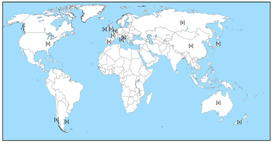 A total of 79 publications dealing with the co-occurrence of toxins in shellfish was retrieved. The mixtures reported depend on the toxins that were investigated. Table 3 sums the information on the toxin mixtures that were investigated in these studies. Among these 79 publications, only 44 were suitable for analysis. Geographical repartition is depicted in Figure 2.