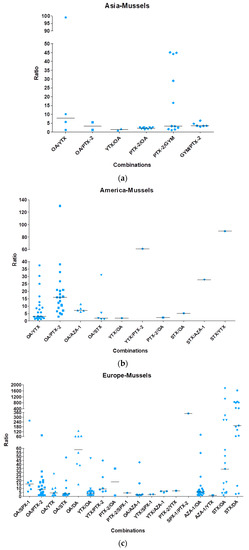 Figure 3 shows the data regarding the contamination of mussels. In Asia, six combinations were reported: OA/YTX with a median ratio of eight and all the other combinations (OA/PTX-2, YTX/OA, PTX-2/OA, PTX-2/GYM and GYM/PTX-2) with a median ratio between one and five. In America, ten combinations were reported: OA/YTX, OA/STX, YTX/OA, PTX-2/OA with similar median ratios of 3–4, OA/PTX-2 with a median ratio of 15, OA/AZA-1 and STX/OA with median ratios between 5 and 8, STX/AZA-1 with a ratio around 28, YTX/PTX-2 with a ratio of 60, and STX/YTX with a ratio around 90. In Europe, 18 combinations were reported: OA/SPX-1 and PTX-2/OA with similar median ratios of 16, OA/PTX-2 and YTX/PTX-2 with similar median ratios of 8–9, STX/OA with a median ratio of 33, OA/DA with a median ratio of 58, STX/DA with a median ratio of 200, SPX-1/PTX-2 with a ratio of 350 and all other combinations (OA/YTX, OA/STX, YTX/OA, PTX-2/SPX-1, OA/AZA-1, YTX/SPX-1, YTX/AZA-1, PTX-2/YTX, AZA-1/OA and AZA-1/YTX) with median ratios between 1 and 7. In Oceania, seven combinations were reported: YTX/PTX-2 and PTX-2/YTX with median ratios between 1 and 4, YTX/OA and PTX-2/OA with similar median ratios of 13–14, YTX/GYM with a median ratio of 21, YTX/DA with a median ratio of 60 and PTX-2/GYM with a median ratio around 750.
