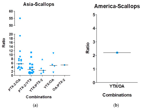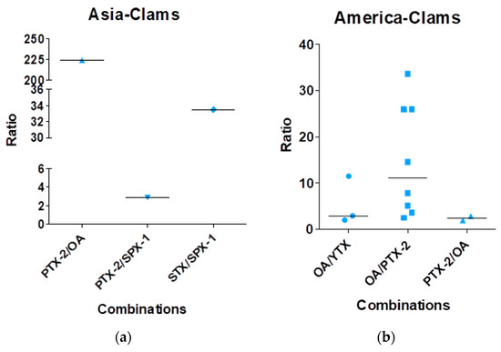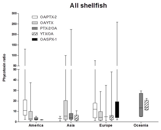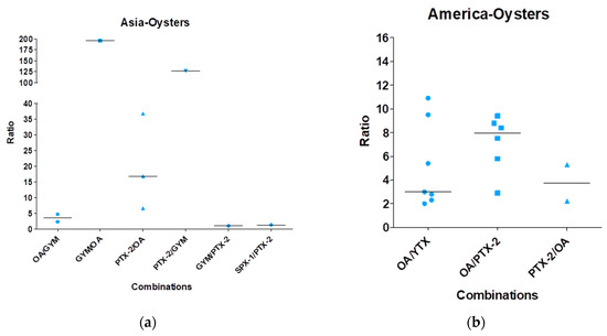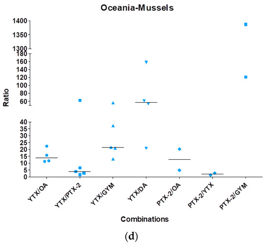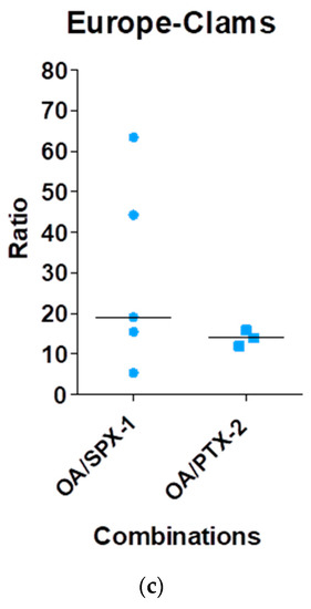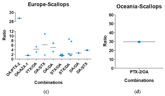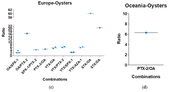 Figure 4 shows the data regarding the contamination of oysters. In Asia, six combinations were reported: OA/GYM, GYM/PTX-2 and SPX-1/PTX-2 with ratios between 1 and 4, PTX-2/OA with a median ratio of 16, PTX-2/GYM with a ratio of 125 and GYM/OA with a ratio around 200. In America, three combinations were reported: OA/YTX and PTX-2/OA with similar median ratios of 3–4 and OA/PTX-2 with a median ratio of eight. In Europe, 10 combinations were reported: OA/PTX-2 with a ratio around 16, STX/DA with a ratio of 21, STX/OA with a ratio of 60 and all the other combinations (OA/SPX-1, SPX-1/PTX-2, PTX-2/OA, YTX/OA, YTX/PTX-2, YTX/SPX-1 and YTX/AZA-1) with a median ratio between 2 and 6. In Oceania, only the mixture PTX-2/OA with a ratio of six was reported.