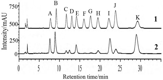 HPLC chromatogram of FPS extracted from Sargassum pallidum. Note: A. PMP; B. d-mannose (Man); C. d-glucosamine (GlcN); D. l-rhamnose (Rha); E. d-glucruonic acid (GlcA); F. d-galacturonic acid (GalA); G. d-galactosamine (GalN); H. d-glucose (Glc); I. d-galactose(Gal); J. d-xylose (Xyl); K. l-fucose (Fuc). 1-Monosaccharide standards; 2-FPS extracted from Sargassum pallidum.