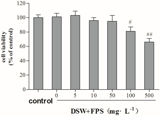 Cytotoxity of combination treatment of DSW and FPS on HepG2 cells. HepG2 cells were incubated with co-treatment with DSW and FPS of different concentrations (5, 10, 50, 100, and 500 mg·L−1) for 24 h. Then, cell viability was measured by the MTT method. Data are presented as mean ± SD from three independent experiments (n = 8 per group). # p < 0.05, ## p < 0.01: Significant difference vs. the control group.