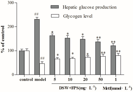 Combination treatment of DSW and FPS repressed hepatic glucose production and an increased glycogen level in IR-HepG2 cells. HepG2 cells were co-treated with a high glucose concentration and combination of DSW and FPS of different concentrations (5, 10, 20, and 50 mg·L−1) for 24 h. Then, levels of hepatic glucose production and glycogen were detected using kits respectively. Data were presented as mean ± SD from three independent experiments (n = 8 per group). ## p < 0.01: Significant difference vs. the control group; * p < 0.05, ** p < 0.01: Significant difference vs. the model group.