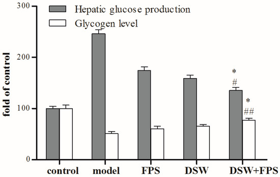 Comparison of hepatic glucose production and glycogen level between combination treatment of DSW and FPS and single application of DSW or FPS in IR-HepG2. HepG2 cells were co-treated with a high glucose concentration and DSW alone, or FPS alone, or a combination of DSW and FPS at a dosage of 50 mg·L−1 for 24 h. Then, levels of hepatic glucose production and glycogen were detected using kits respectively. Data were presented as mean ± SD from three independent experiments (n = 8 per group). # p < 0.05, ## p < 0.01: Significant difference vs. the FPS group; * p < 0.05,: Significant difference vs. the DSW group.