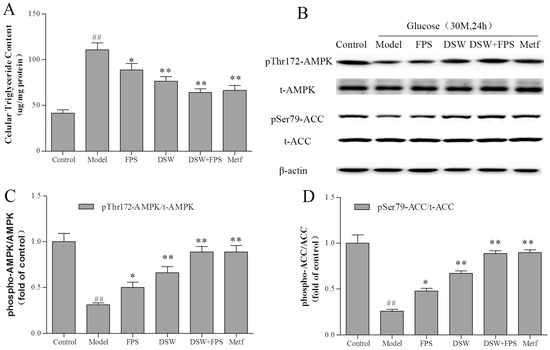 AMPK activation is thought to be a key proximal event in the cellular energy balance response, and triglyceride is a central feature of IR. We further investigated the effect of co-treatment with DSW and FPS on AMPK and its downstream effector, ACC, as well as on triglyceride content in HepG2 cells. The results indicated that the inhibition of AMPK and ACC phosphorylation in cells exposed to high glucose concentrations was synergistically restored by co-treatment with DSW and FPS, which was consistent with a decreasing intracellular triglyceride level.