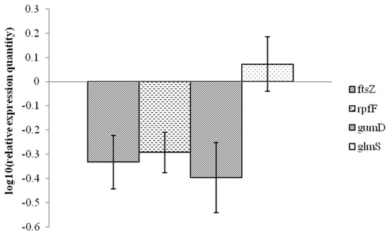Quantitative real-time PCR analysis of expression of four genes (rpfF, gumD, ftsZ, glmS) in X. oryzae pv. oryzae PXO99A in response to 1-DGlcNAc treatment. Values were normalized to the levels of 16S rRNA, an internal reference gene. The y-axis represents mean expression values ± SD relative to the control. The experiment was independently repeated three times.