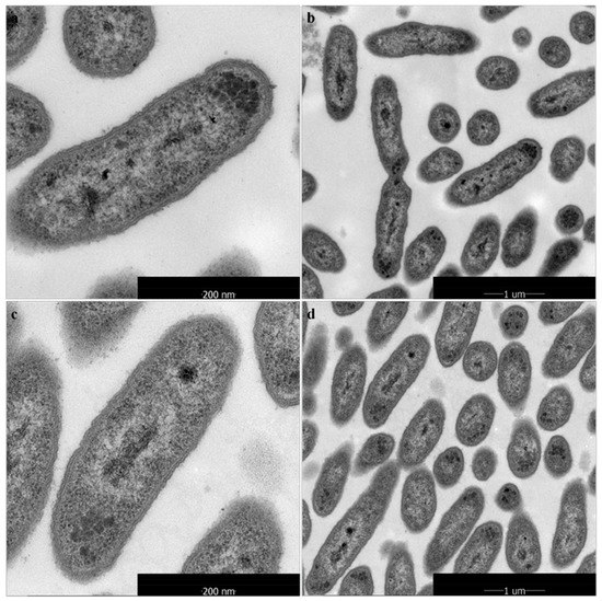 Ultrastructural effects of 100 μg/mL 1-DGlcNAc on Xanthomonas cells after 3 h determined by TEM. (a,b) untreated X. oryzae pv. oryzae cells; (c,d) treated X. oryzae pv. oryzae cells.