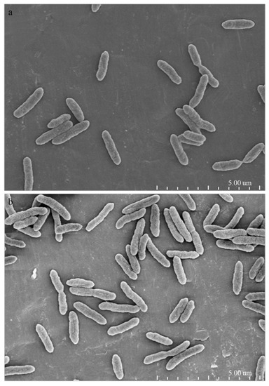 Ultrastructural effects of 100 μg/mL 1-DGlcNAc on Xanthomonas cells after 3 h determined by SEM. (a) untreated X. oryzae pv. oryzae cells; (b) treated X. oryzae pv. oryzae cells.