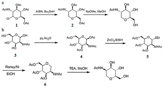 Its diastereomer was synthesized as shown in Figure 5b. Compound 3 (5.0 g, 23 mmol) in pyridine (50 mL) was mixed with Ac2O (12 g, 113 mmol) at 0–25 °C for 12 h. Compound 4 (8 g, 91% yield) was obtained as a white solid. Compound 4 (1.2 g, 3.08 mmol) in DCM (5 mL) was added to ZnCl2 (1 M, 4.62 mL) and EtSH (12 mL) at 0 °C, the mixture solution was stirred at 0 °C for 12 h, then heated to 40 °C for 3 h. Compound 5 (1.80 g, 50% yield) was obtained as a white foam solid. Raney-Ni (3.40 g, 39.7 mmol) was suspended in anhydrous ethanol (15 mL), stirred for 3 min, then let stand. EtOH was decanted. The process was repeated four times until the ethanol phase became clear after standing. 10 mL EtOH was added and then compound 5 (300.00 mg, 766.40 μmol) was added. Under stirring, the residue was de-gassed by bubbling N2 for 10 min, the mixture solution was heat under reflux a N2 atmosphere for 0.5 h. Compound 6 (120 mg, 16% yield) was obtained as a white solid. Compound 6 (120 mg, 362 μmol) in MeOH (1.00 mL) was added to NaOMe (9.9 mg, 181 μmol) at 25 °C for 1 h. 2-acetamido-1,5-anhydro-2-deoxy-d-mannitol (48.00 mg, 65% yield) was obtained as a white solid. The purity and structure of the products were checked by MS and NMR.